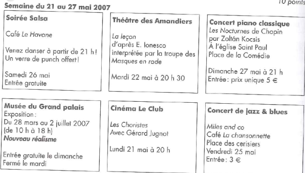 Pendant le we du 26 et 27 mai, vous voulez organiser une sortie le soir. Où pouvez-vous aller ?